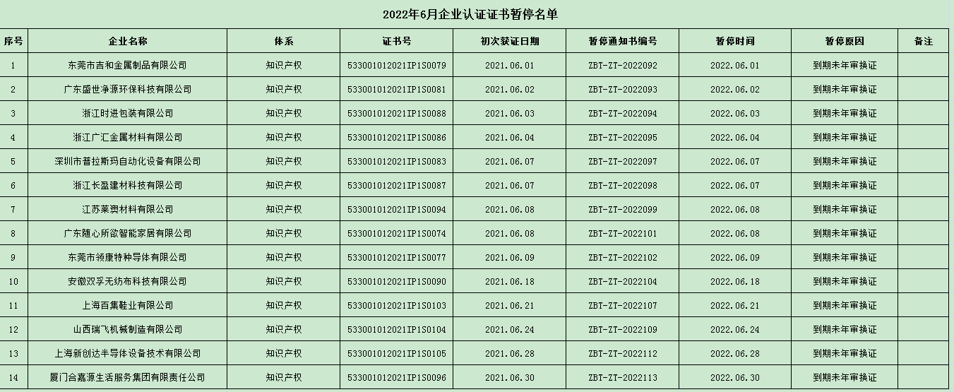 通知 2022年6月企業(yè)認(rèn)證證書暫停名單