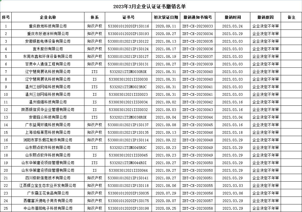 通知 2023年03月企業(yè)認證證書撤銷名單